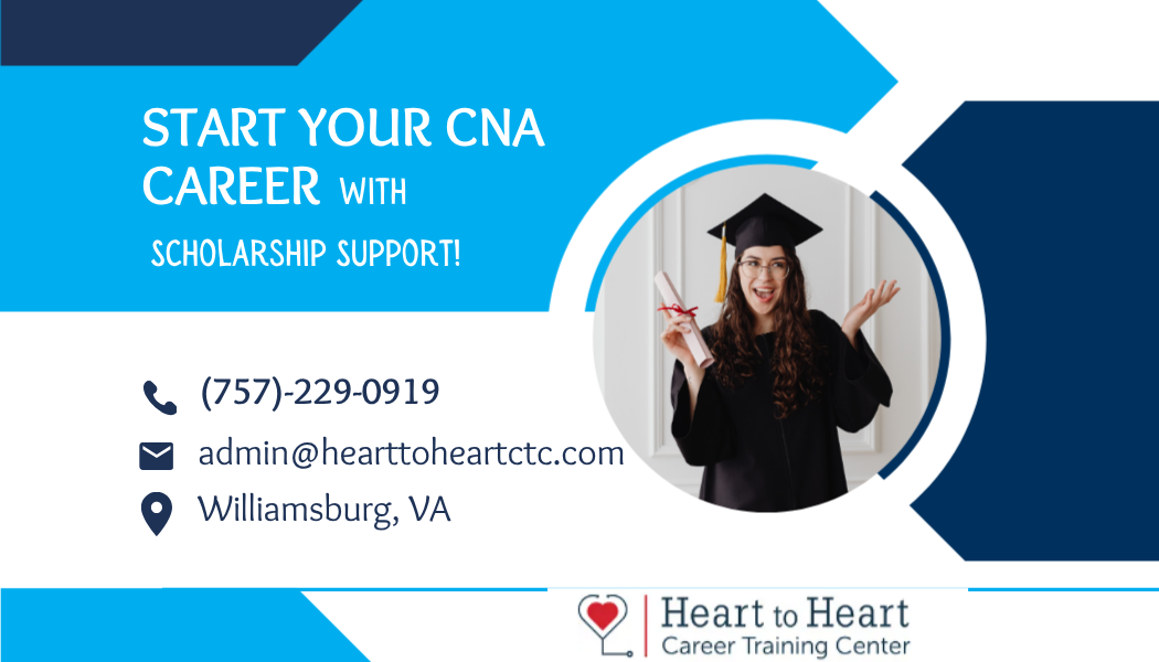 At Heart to Heart Career Training Center, we want to ensure your success as a Certified Nursing Assistant (CNA), Medical Assistant (MAC), Phlebotomy, EKG Technician, and in CPR training programs in Williamsburg VA!