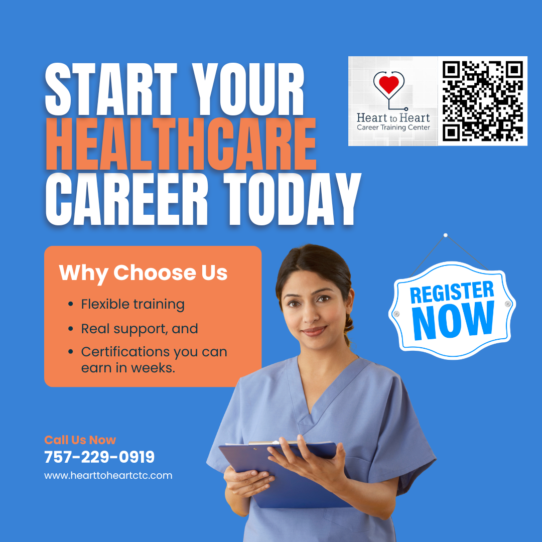 Looking to start a rewarding career in healthcare? Heart to Heart Career Training Center in Williamsburg, VA helps you gain in-demand