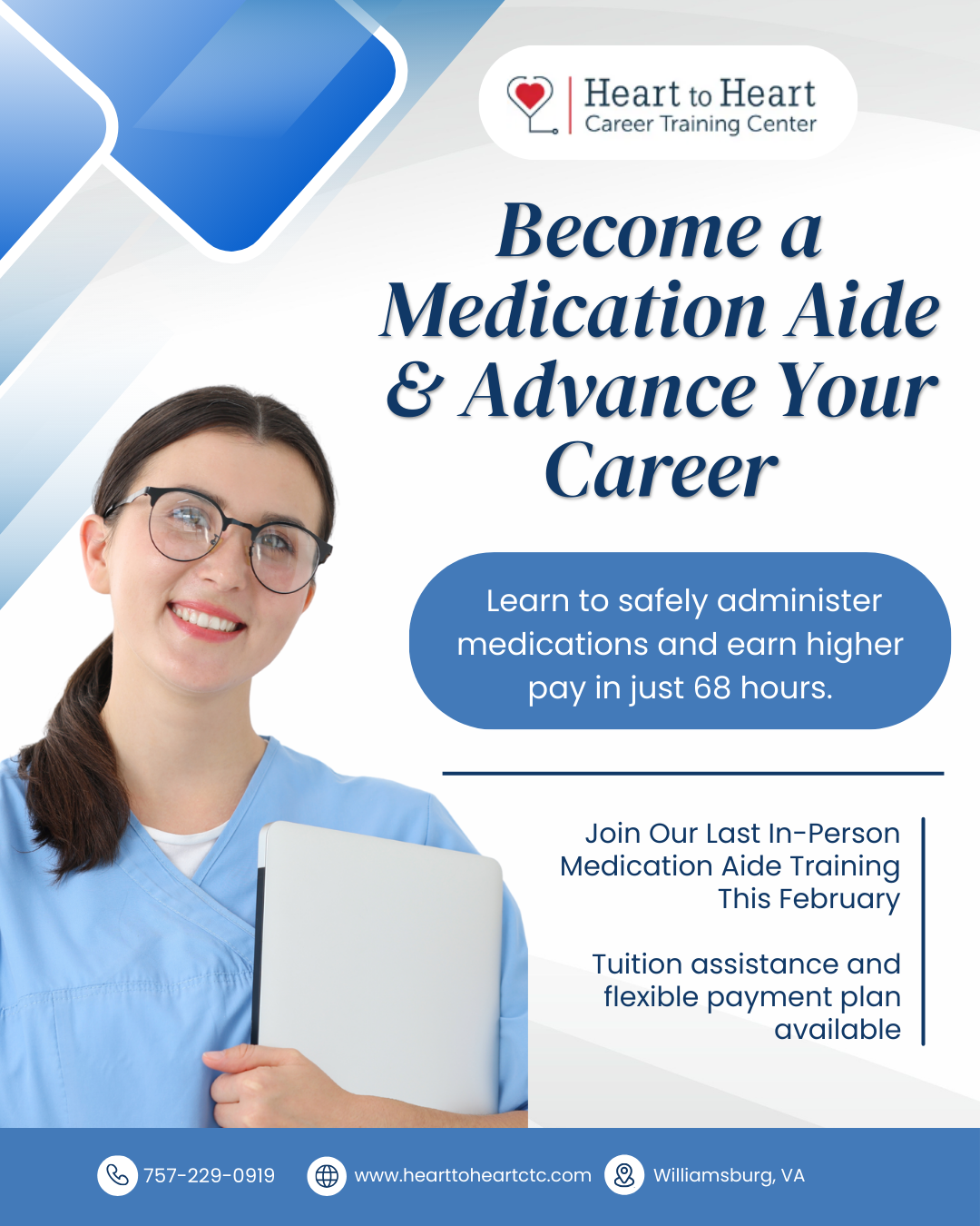 Are you ready to take your healthcare skills to the next level? Heart-to-Heart Career Training Center is offering our final 68-hour Medication Aide (Med Tech) Hybrid Class, starting February 23! This unique program combines online learning with hands-on onsite skills training, preparing you for success in the healthcare field.