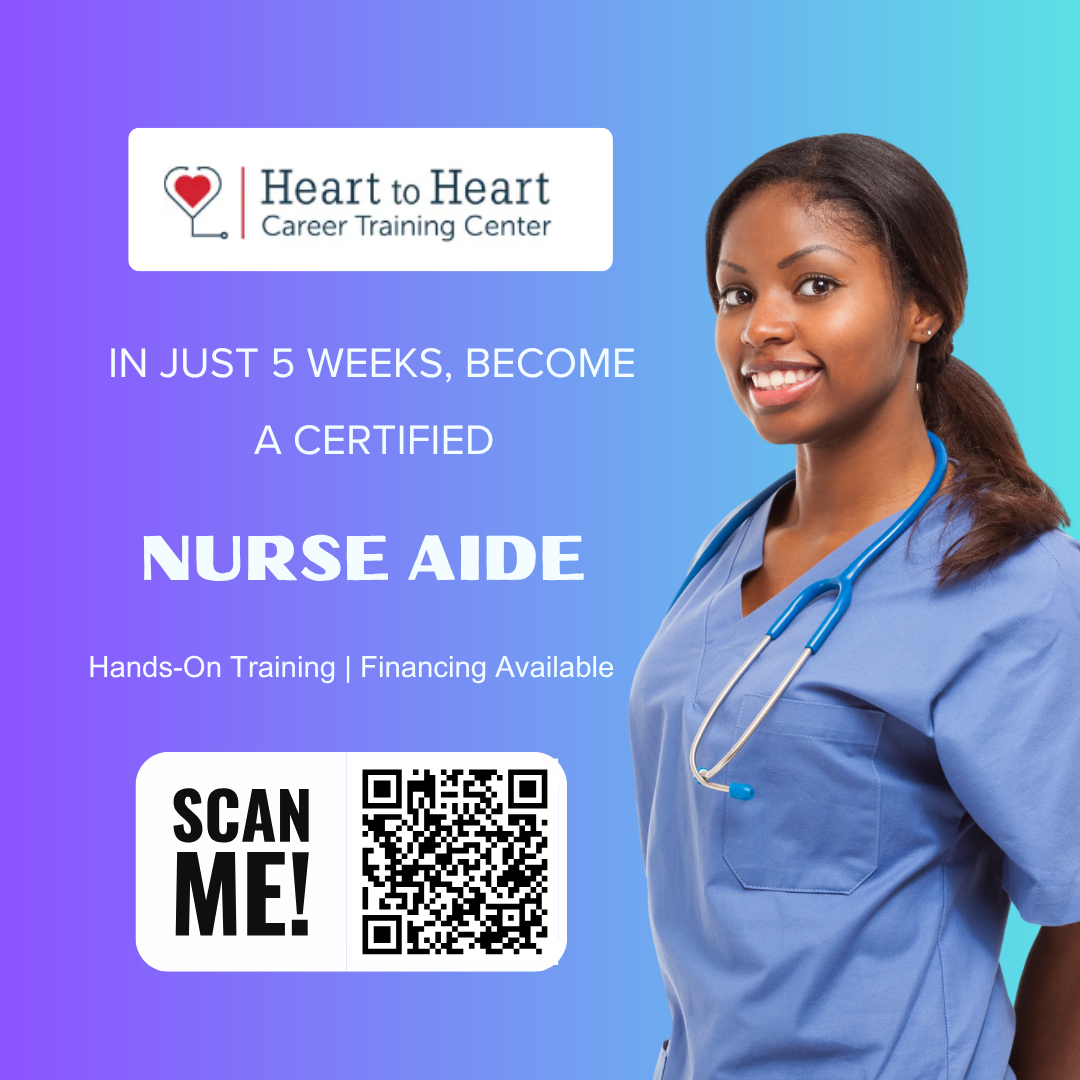 The demand for Certified Nurse Aides (CNAs) continues to grow, making this an excellent time to start a career in healthcare. Heart-to-Heart Career Training Center’s CNA Training Program begins November 17, 2025. This 5-week, 140-hour hybrid program combines online learning with hands-on onsite skills practice. Students learn to assist patients with daily living activities, monitor vital signs, and support nurses and doctors. Graduates are eligible to take the Virginia State CNA Exam and begin working in a field where trained professionals are in demand. Requirements include immunization records, CPR certification, and a background check. Flexible financing is available through Affirm with no impact on your credit score: Heart-to-Heart Financing